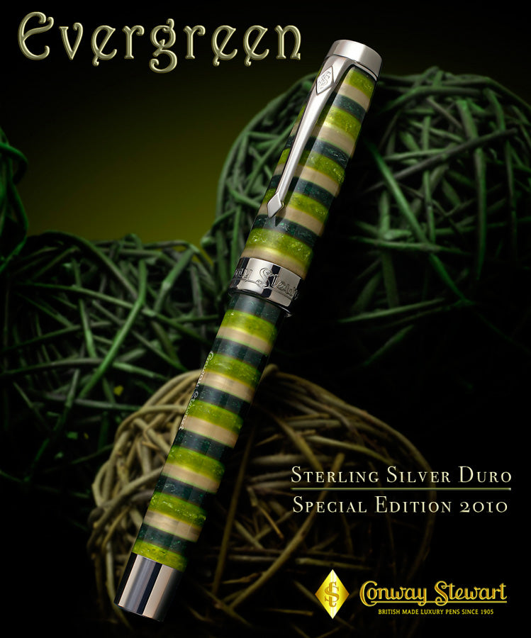 Welcome to our February 2010 Special Edition — the Conway Stewart Evergreen. Based on our popular Sterling Silver Duro model, the Evergreen is a new finish and only available in 50 numbered writing instruments throughout the world.