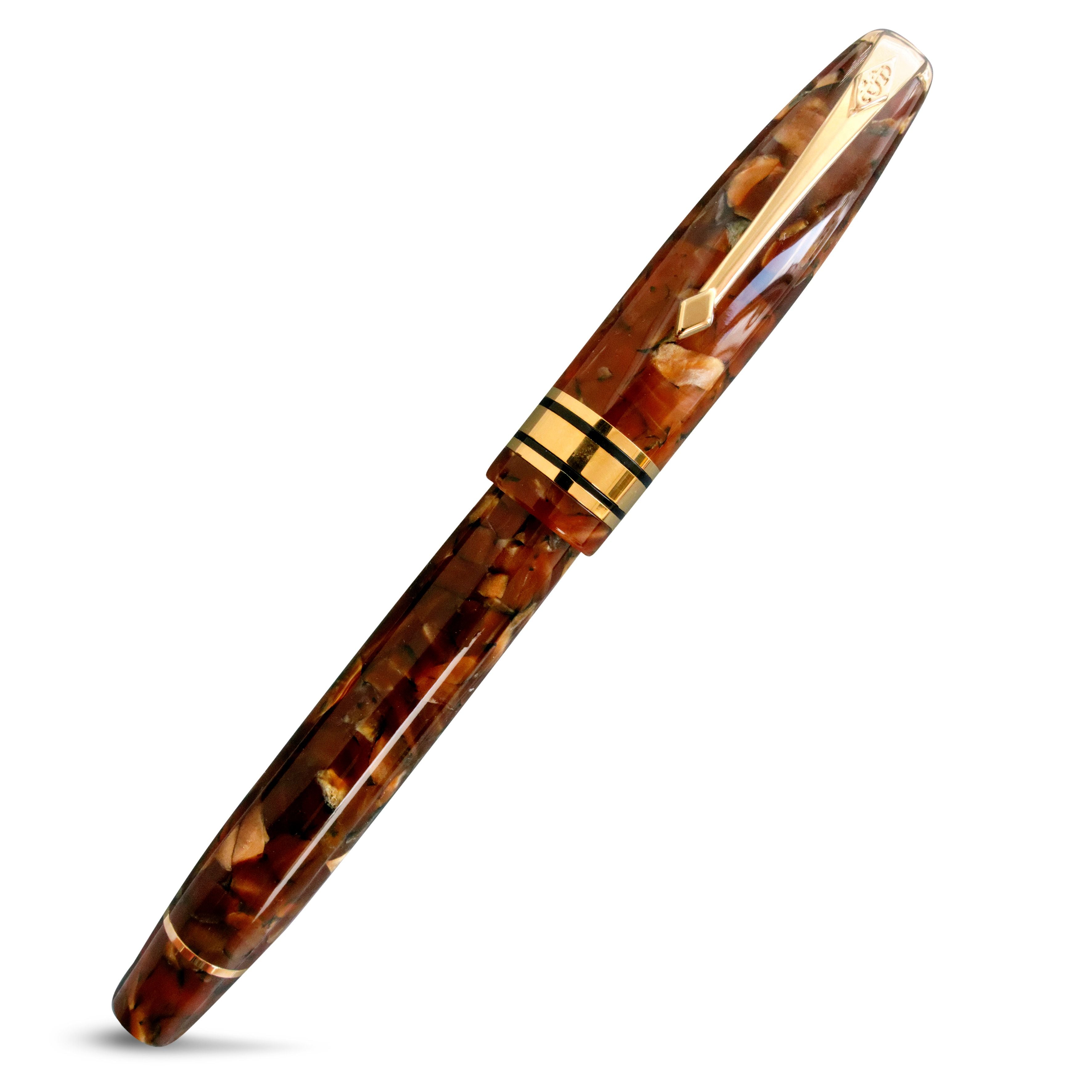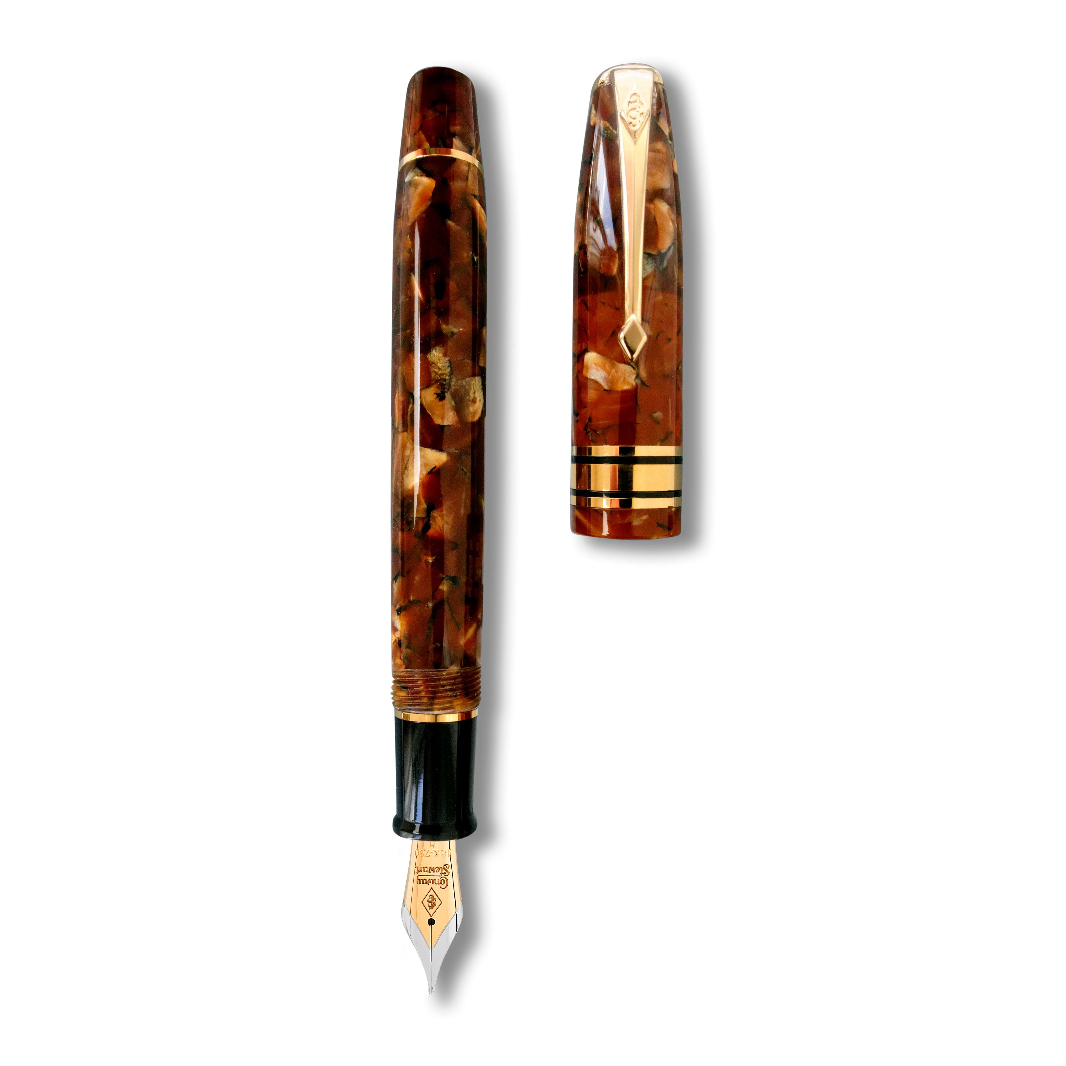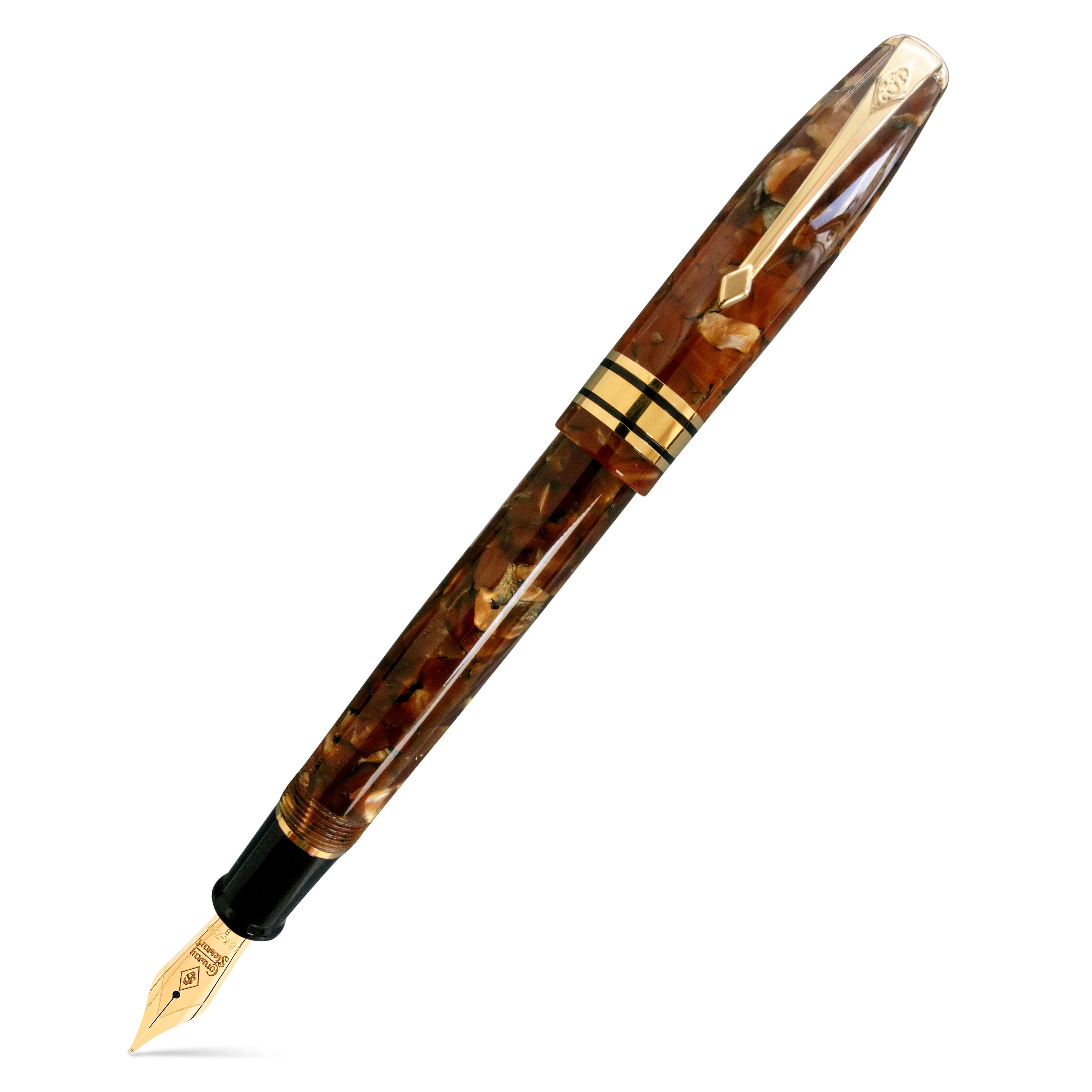 The Conway Stewart Series 100 Bronze is a true classic, made from a timeless amber/bronze acrylic that is instantly recognisable to collectors. With its triple-banded cap, distinctive rounded shape and the Conway Stewart clip, this iconic pen has stood the test of time since its introduction in 1954. The Series 100 Bronze features solid gold cap and barrel rings and a Flag 18ct gold nib, making it the epitome of pen perfection. Available as a fountain pen with a choice of fine, medium or broad nibs, each pen comes in a black leather presentation box that doubles as a pen stand. Join the ranks of British luxury pen collectors with the exquisite Conway Stewart Series 100 Bronze.