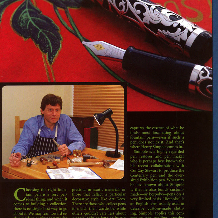 Choosing the right fountain pen is a very personal thing, and when it comes to building a collection, there is no single best way to go about it. We may lean toward either modern or vintage pens, for example, or concentrate on pens of historical note or those with unusual features. Some people are drawn to pens made from precious or exotic materials or those that reflect a particular decorative style, like Art Deco. There are those who collect pens to match their wardrobe, while others couldn't care less about a pen's looks as long as its nib meets their criteria for perfection. Whatever the inclination, a true collector is always on the lookout for that one pen that captures the essence of what he finds most fascinating about fountain pens-even if such a pen does not exist. And that's where Henry Simpole comes in.