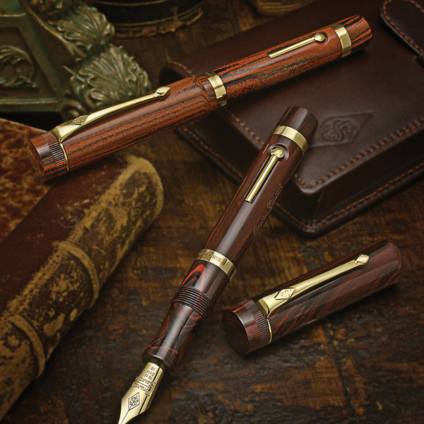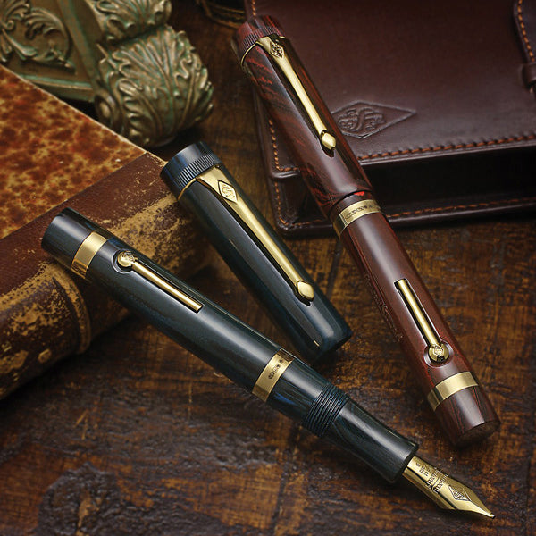 Complete with engraving accents on the cap top, wide barrel bands crafted from solid 18 carat solid gold or sterling silver, and a choice of traditional lever fill system, eyedropper fill, or cartridge converter, the Marlborough Vintage looks like it has stepped right out of the 1920s.