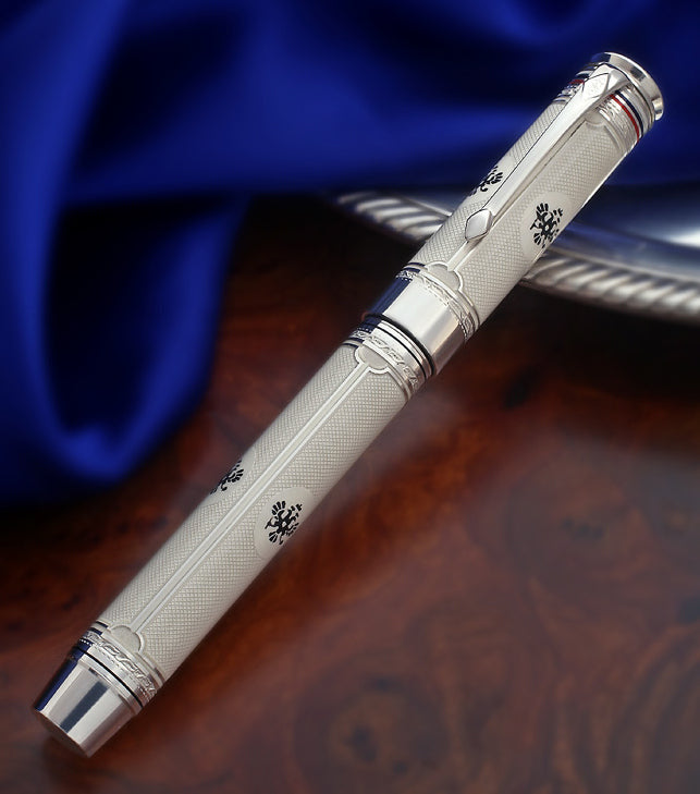 To highlight the stunning engraving, the cap and barrel have been skillfully covered with delicate pearlescent white bonded enamel inlaid with the famous Romanoff Double Eagle Crest.