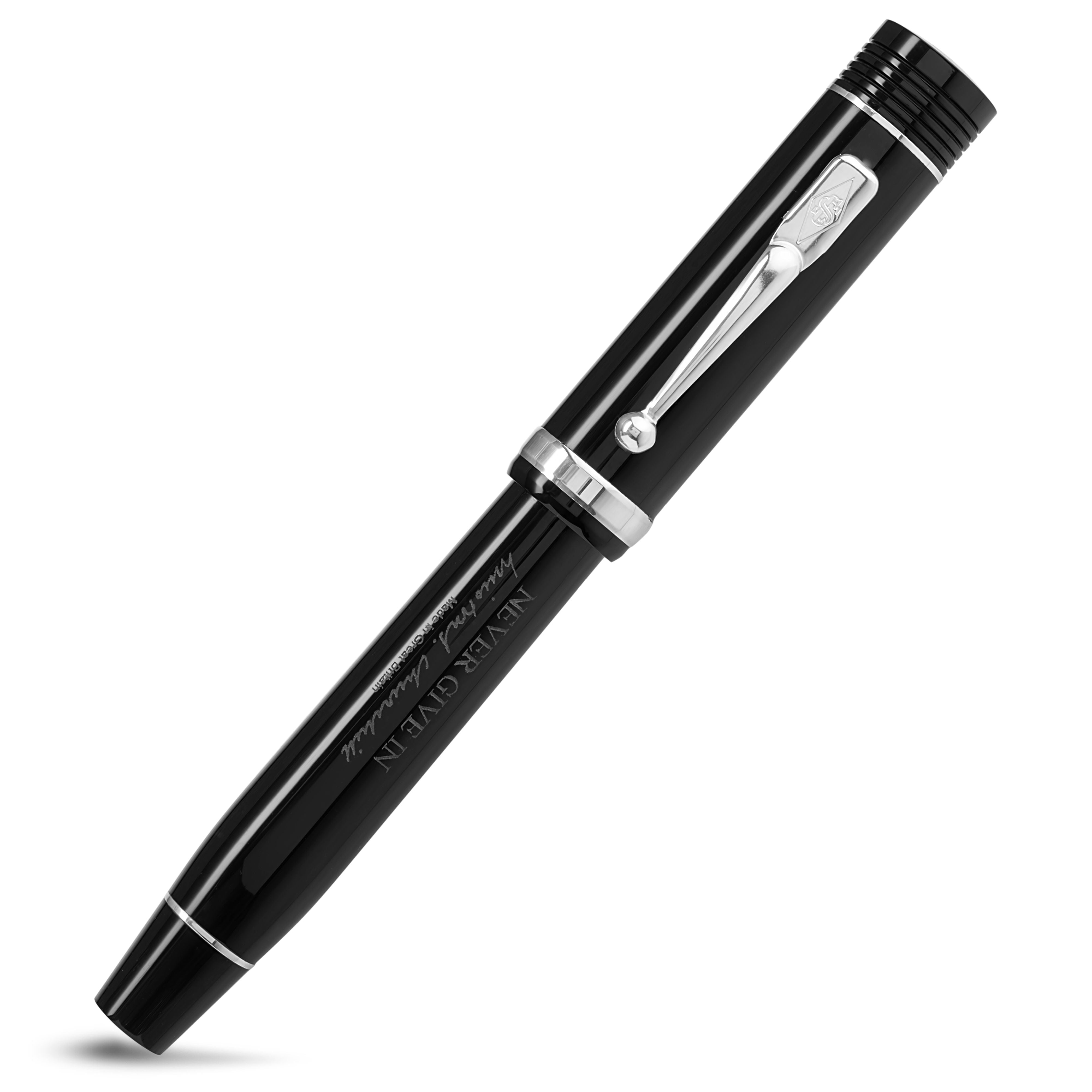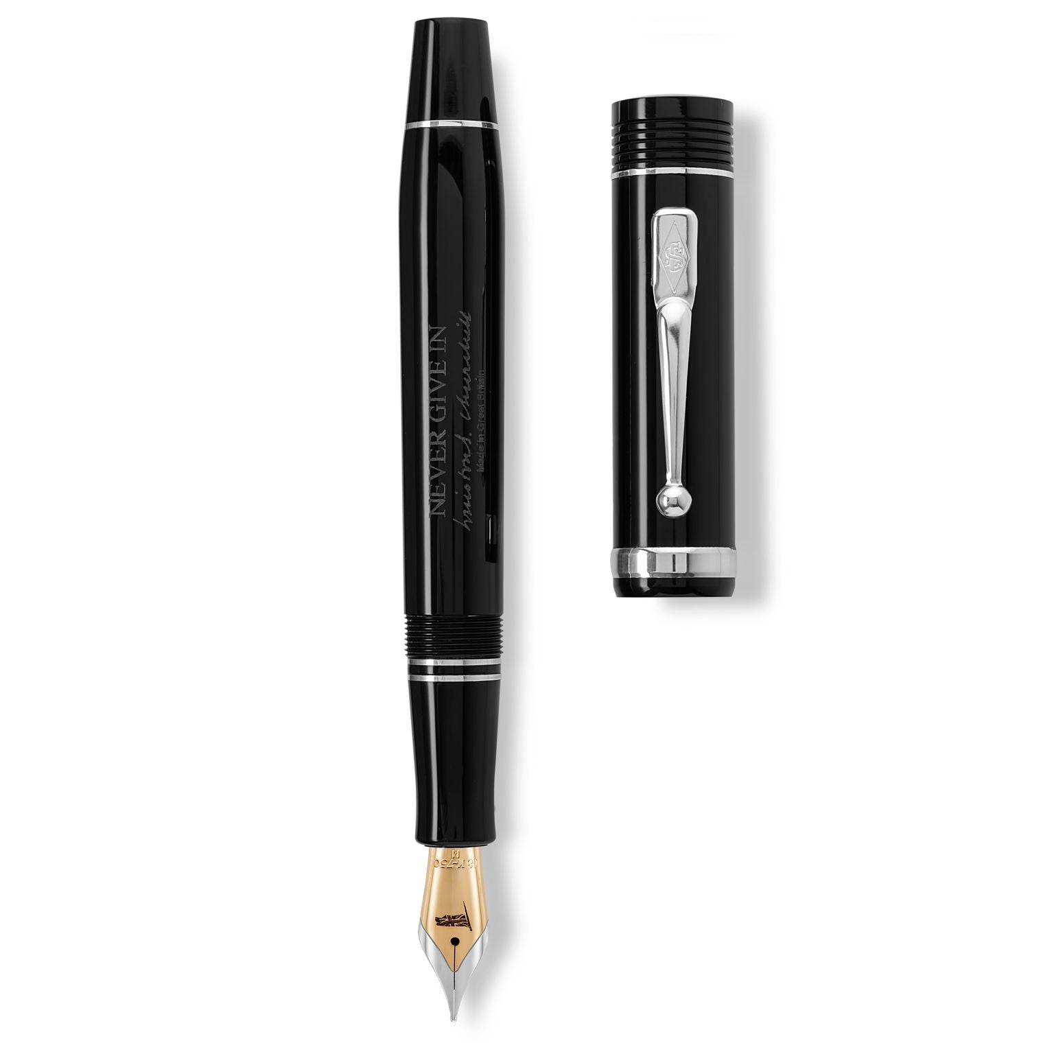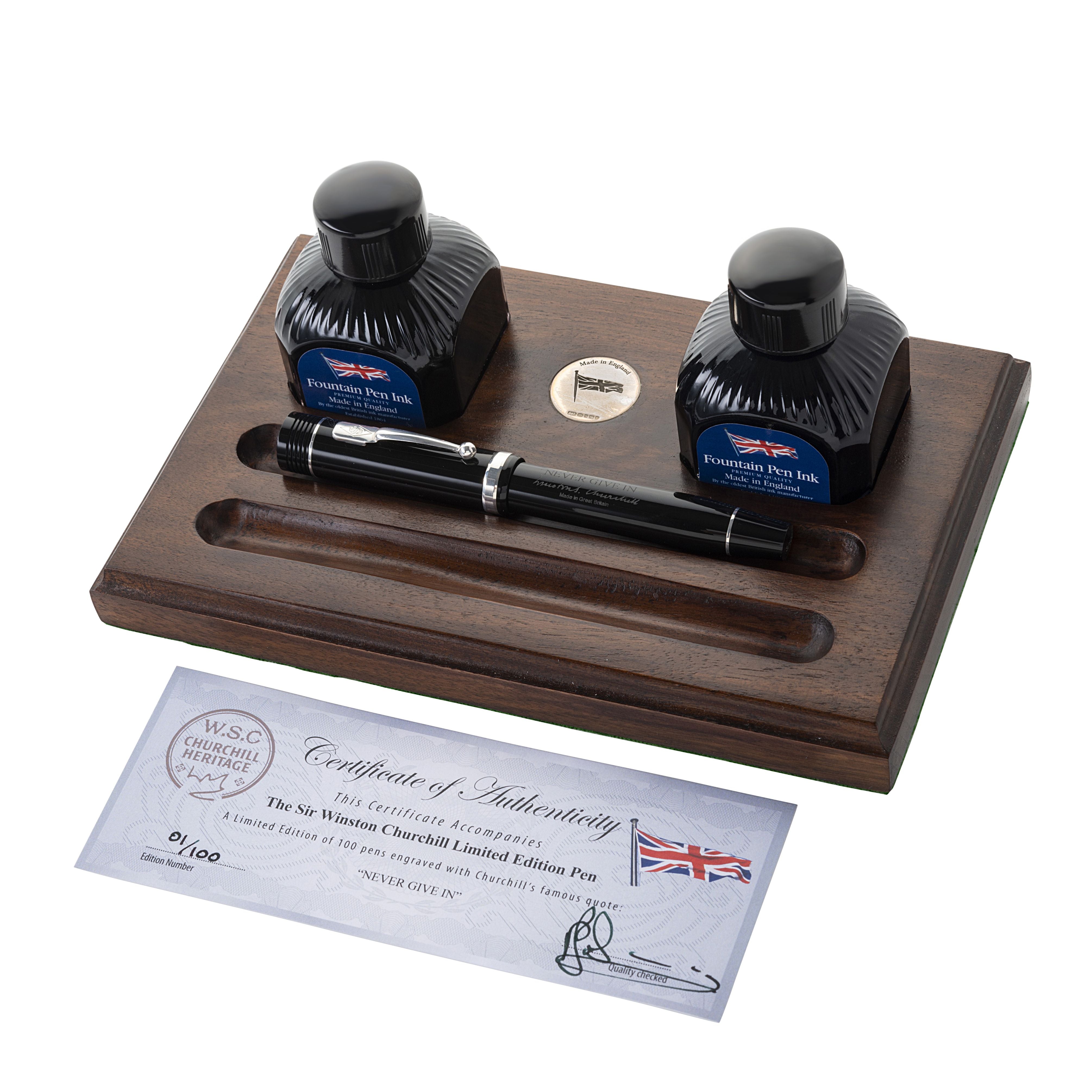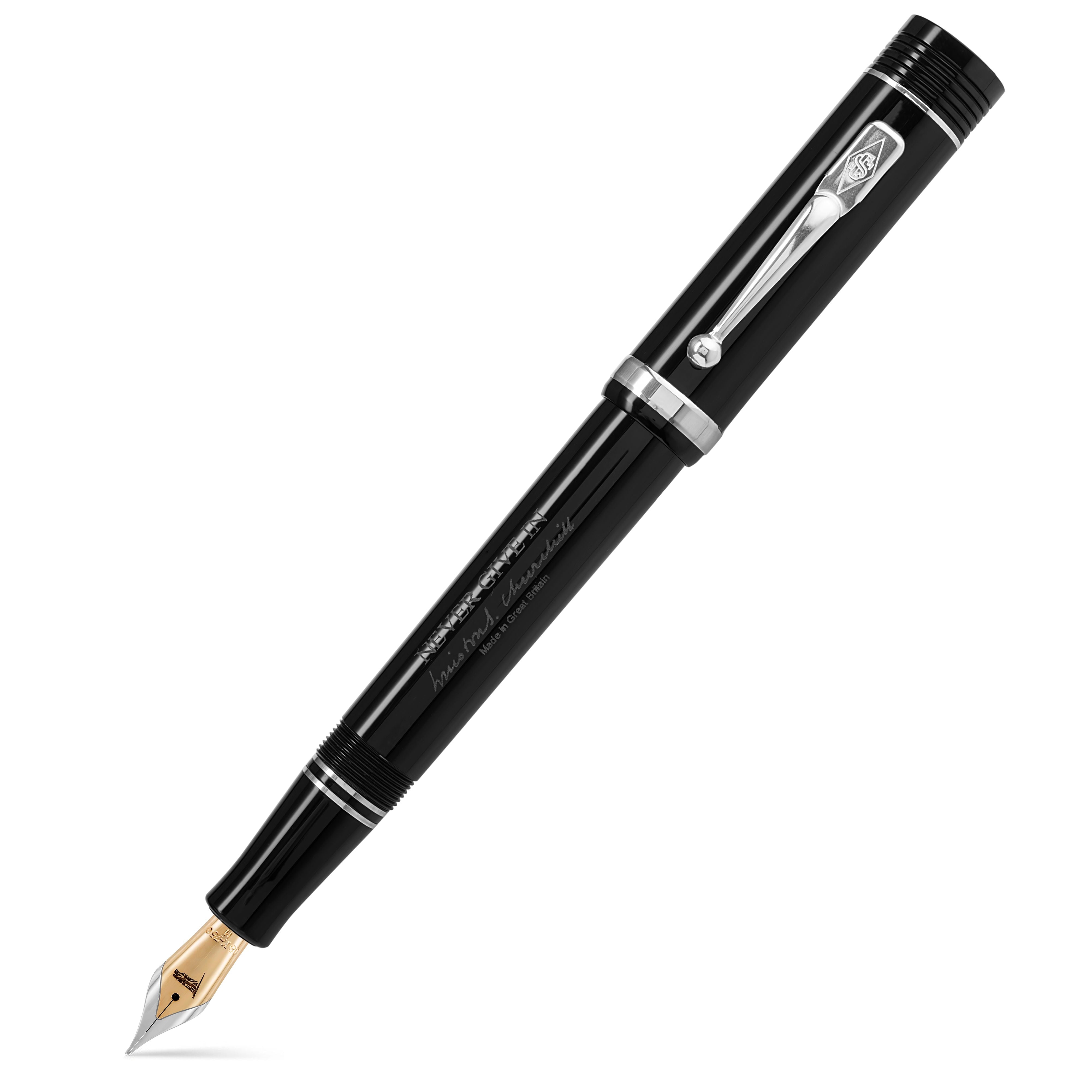 Der „Never Give In“-Stift von Conway Stewart Churchill Heritage ist der zweite in einer Serie, die in Zusammenarbeit mit Churchill Heritage hergestellt wurde und Wohltätigkeitsorganisationen unterstützt, die das Erbe von Sir Winston Churchill bewahren. Dieser Kugelschreiber in limitierter Auflage ist mit Churchills ikonischer Skizze von „Pug“ und seinem berühmten Zitat „Never Give In“ auf dem Schaft graviert und in Classic Black mit 9 Karat Gold- oder Sterlingsilberbesatz erhältlich. Jeder Stift wird mit einer Replik von Churchills Red Cabinet Box geliefert, die eine Kopie von "Good Advice from Winston Churchill", ein Faksimile seines Briefes von 1909 an seine Frau, und eine Flasche grüne Tinte enthält. Mit nur 100 weltweit hergestellten Stiften und bis zu 20 % von jedem Verkauf, der an Churchill Heritage gespendet wird, ist dieser Stift eine einzigartige und sinnvolle Ergänzung für jede Sammlung.