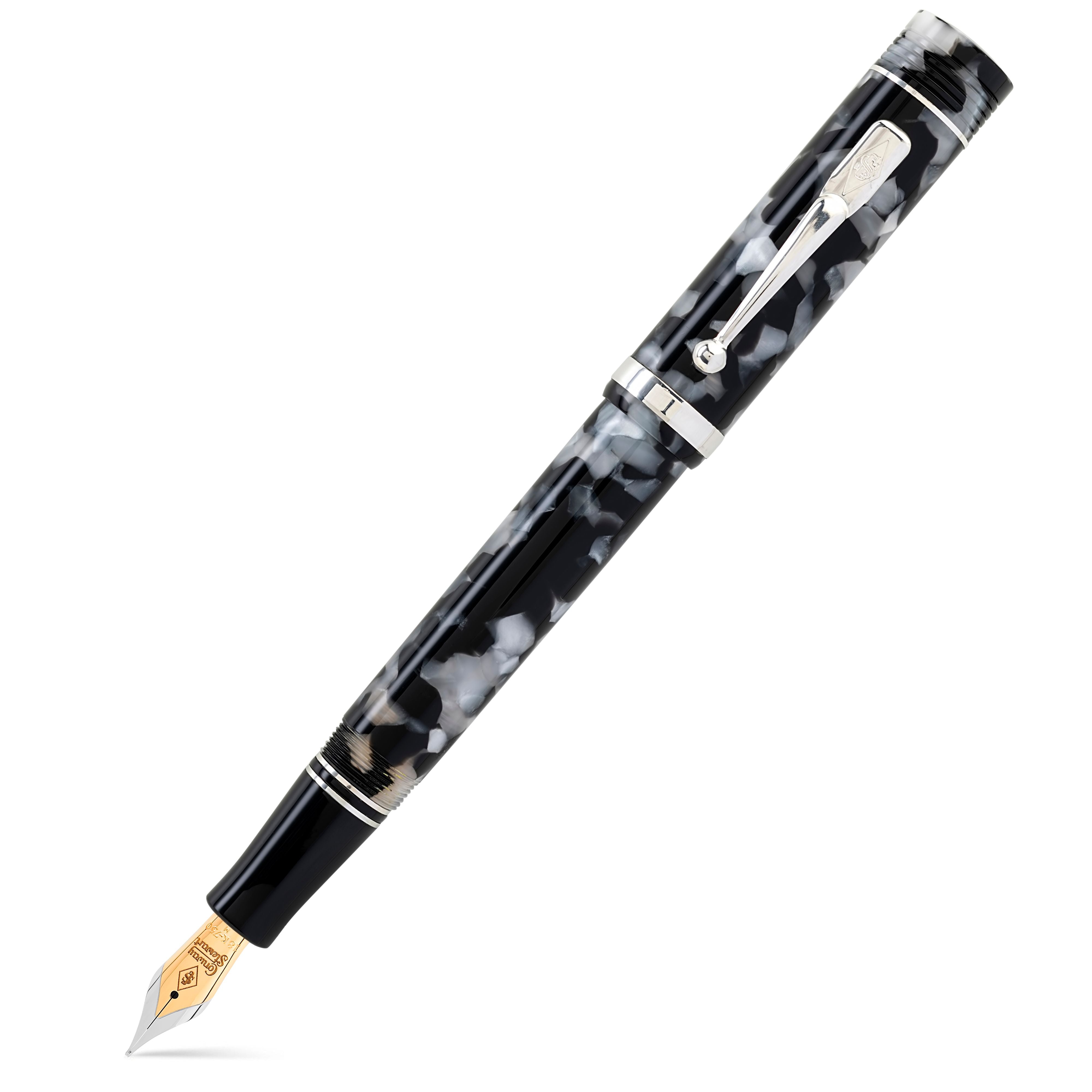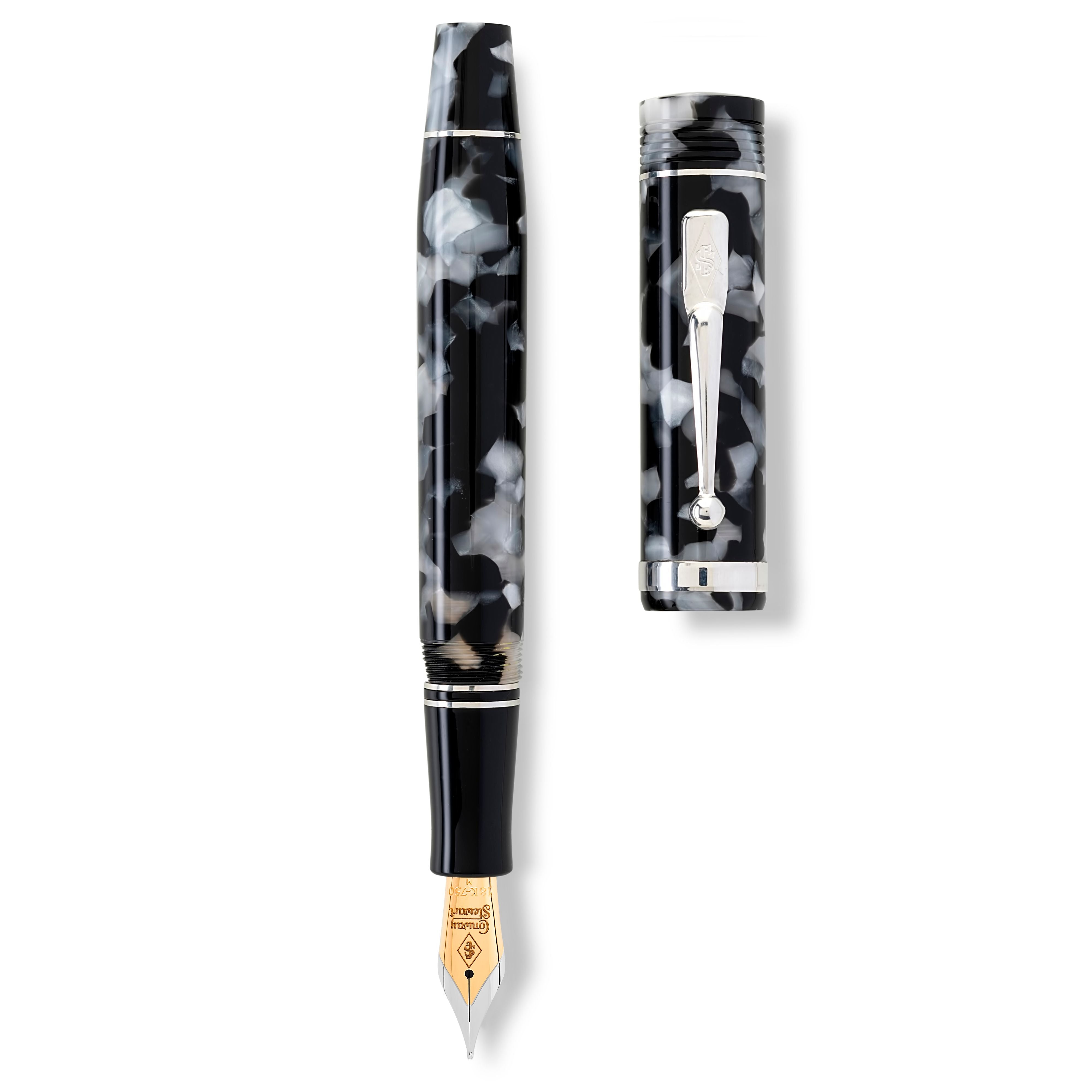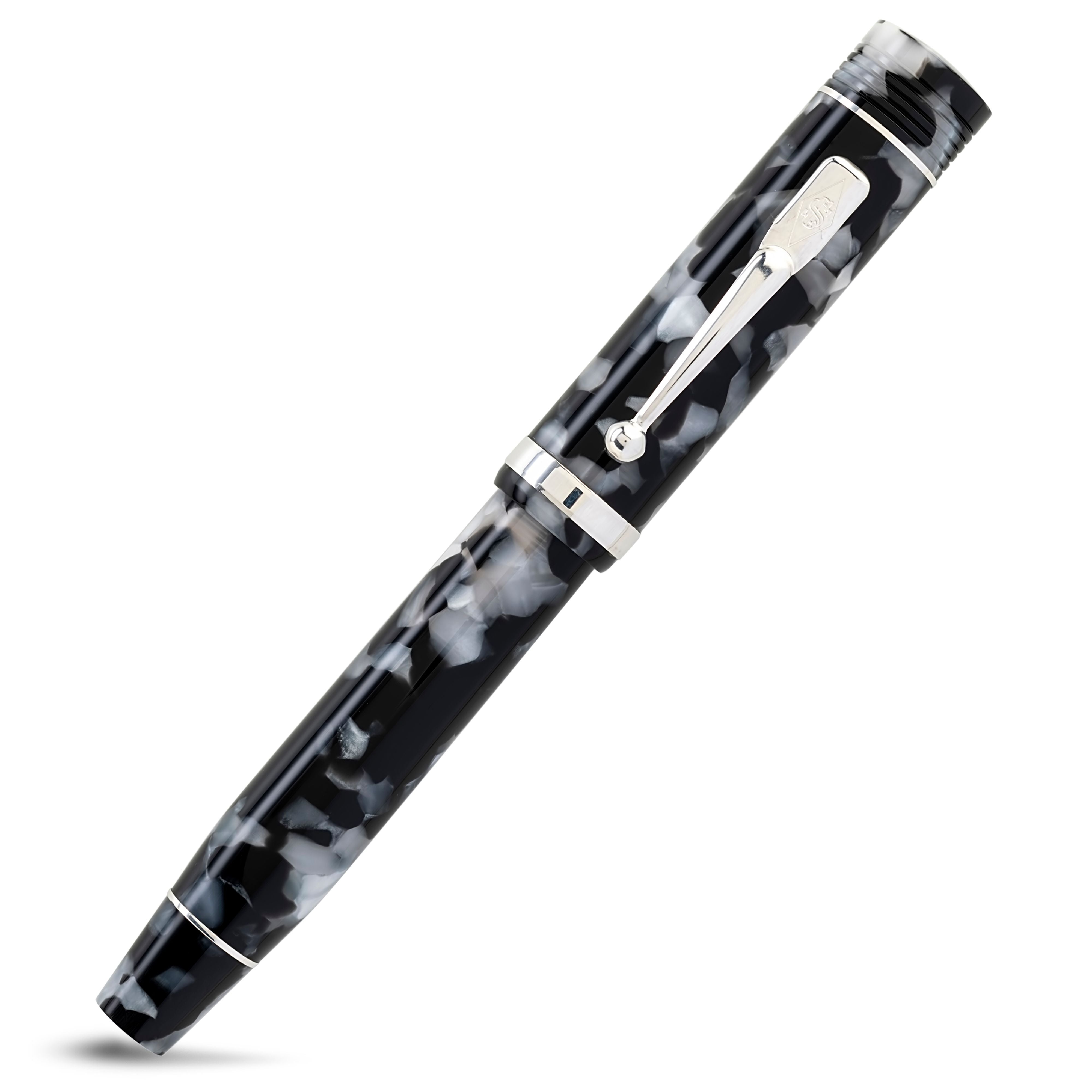 El Conway Stewart Churchill Fresian 15 Limited Editions es un instrumento de escritura único que exhibe una hermosa combinación de resina de mármol negro, gris y blanco con adornos de plata esterlina. El color Fresian es icónico y claramente inglés, lo que hace de este bolígrafo una adición encantadora a cualquier colección. Cada pluma estilográfica está empaquetada en una elegante caja de presentación de cuero sintético negro, que también se puede usar como una elegante exhibición de escritorio. Completo con un Certificado de autenticidad, la Guía del usuario de Conway Stewart y un paño especial para pulir que evita el deslustre, este bolígrafo seguramente deslumbrará e impresionará.