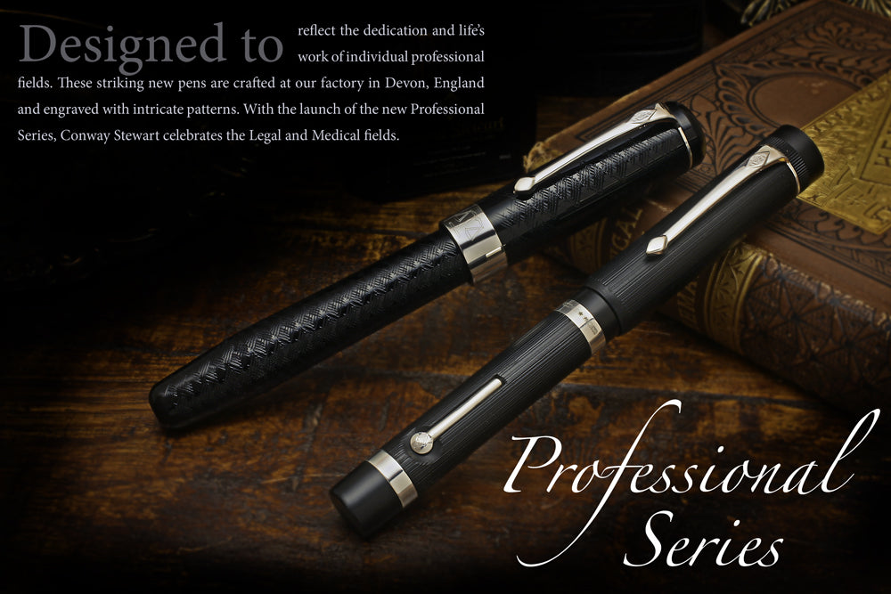 La nouvelle série professionnelle Conway Stewart est conçue pour refléter le dévouement et le travail de toute une vie dans des domaines professionnels individuels. Ces nouveaux designs saisissants sont fabriqués en résine noire brillante et en ébonite mate, gravés de motifs complexes. La série Professionnelle est parfaitement équilibrée dans la main et comporte des plumes en or massif 18 carats avec placage rhodium pour correspondre à la garniture en argent sterling poinçonnée.
