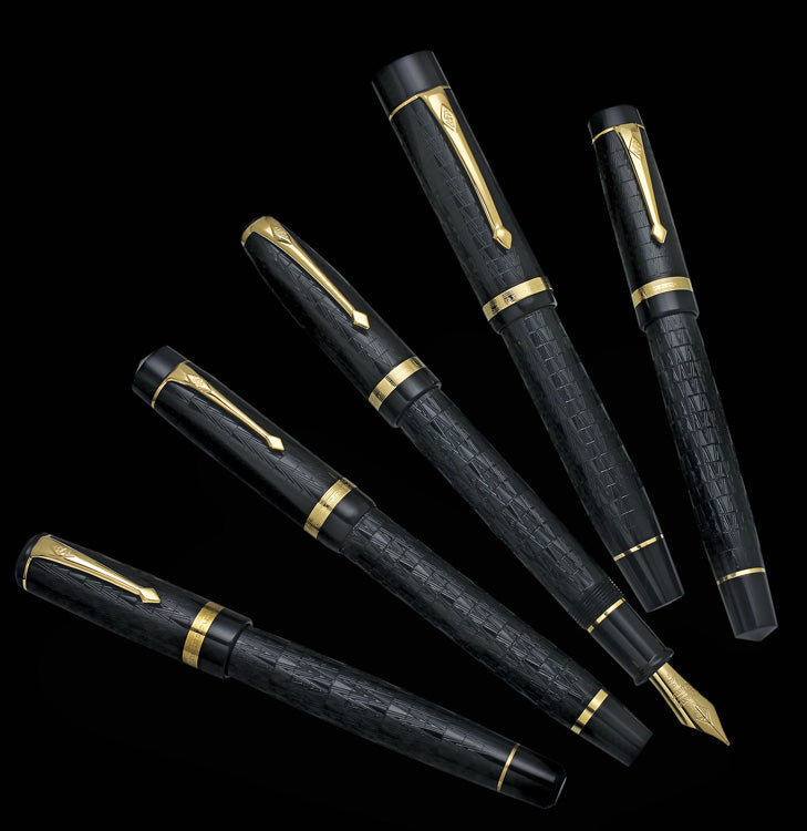 Les cinq instruments d'écriture sont élégamment logés dans un présentoir de présentation en bois laqué noir brillant pour mettre en valeur l'édition limitée Connoisseur.