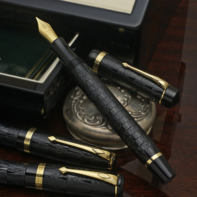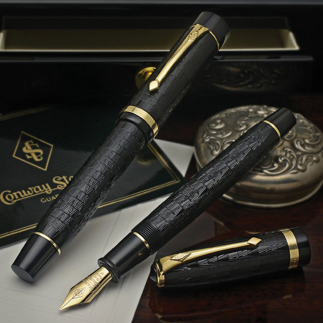 Le Churchill est le modèle phare de longue date de Conway Stewart. Majestueux et intemporel dans son toucher et son apparence, le Churchill est resté un éternel favori de ceux qui préfèrent un instrument d'écriture majestueux et surdimensionné. Avec un capuchon et un corps en résine noire brillante soulignés d'une garniture contrastante en or massif 18 carats, le Connoisseur Churchill se distingue encore davantage par la gravure complexe qui orne à la fois le capuchon et le corps. Le Connoisseur Churchill n'est pas seulement le modèle phare de la collection Connoisseur, il est également parfaitement équilibré pour faciliter l'écriture.
