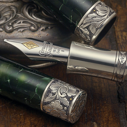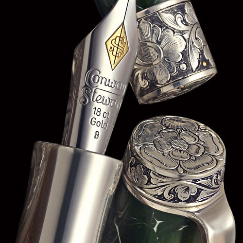ठोस स्टर्लिंग सिल्वर की छड़ों से तैयार किया गया और हाथ से लगाए गए पारभासी क्लासिक ग्रीन रेज़िन विनियर के साथ पूरक, यह स्टर्लिंग सिल्वर ड्यूरो रंग, डिज़ाइन और गुणवत्ता वाले ब्रिटिश शिल्प कौशल का एक अनूठा उत्सव है। कॉनवे स्टीवर्ट कीमती धातु पर इस प्रकार का ओवरले बनाने वाली एकमात्र अंतर्राष्ट्रीय पेन कंपनी है।