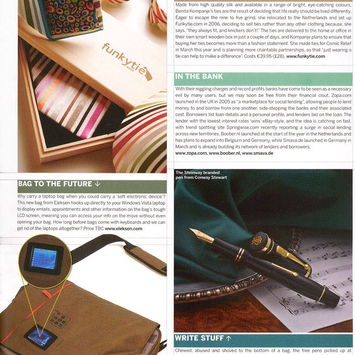 उच्च गुणवत्ता वाले रेशम से बने और उज्ज्वल, आकर्षक रंगों की एक श्रृंखला में उपलब्ध, बेनिता कोम्पांजे के संबंध इस निर्णय का परिणाम हैं कि जीवन को वास्तव में अलग तरह से जीना चाहिए। नौ से पांच पीस से बचने के लिए उत्सुक, वह नीदरलैंड चली गई और 2006 में फंकीटी. टाई कुछ ही दिनों में उनके अपने स्मार्ट लकड़ी के बक्से में घर या कार्यालय में पहुंचा दी जाती हैं, और कोम्पांजे यह सुनिश्चित करने की योजना बना रही है कि उसके टाई खरीदना एक फैशन स्टेटमेंट से अधिक हो जाए। उसने इस साल मार्च में कॉमिक रिलीफ के लिए संबंध बनाए और अधिक धर्मार्थ साझेदारी की योजना बना रही है, ताकि "केवल एक टाई पहनने से अंतर बनाने में मदद मिल सके लागत €39.95 (£28)। www.funkytie.com।