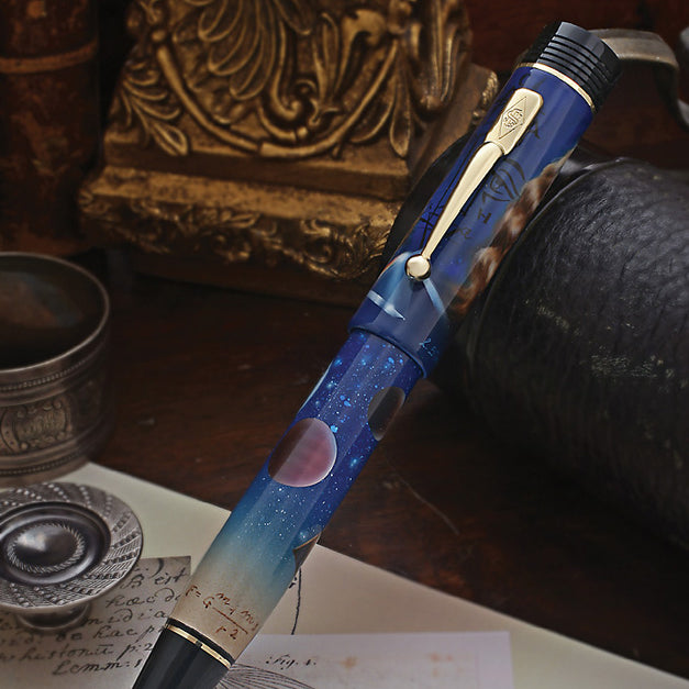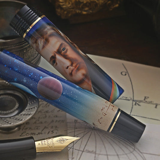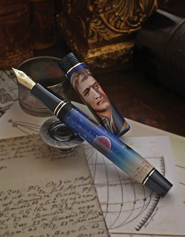 コンウェイ スチュワート サー アイザック ニュートン リミテッド エディションはハンド ペイントの芸術を使用して作成され、キャップとバレルには彼の肖像画と最も有名な数学理論が組み込まれています。