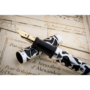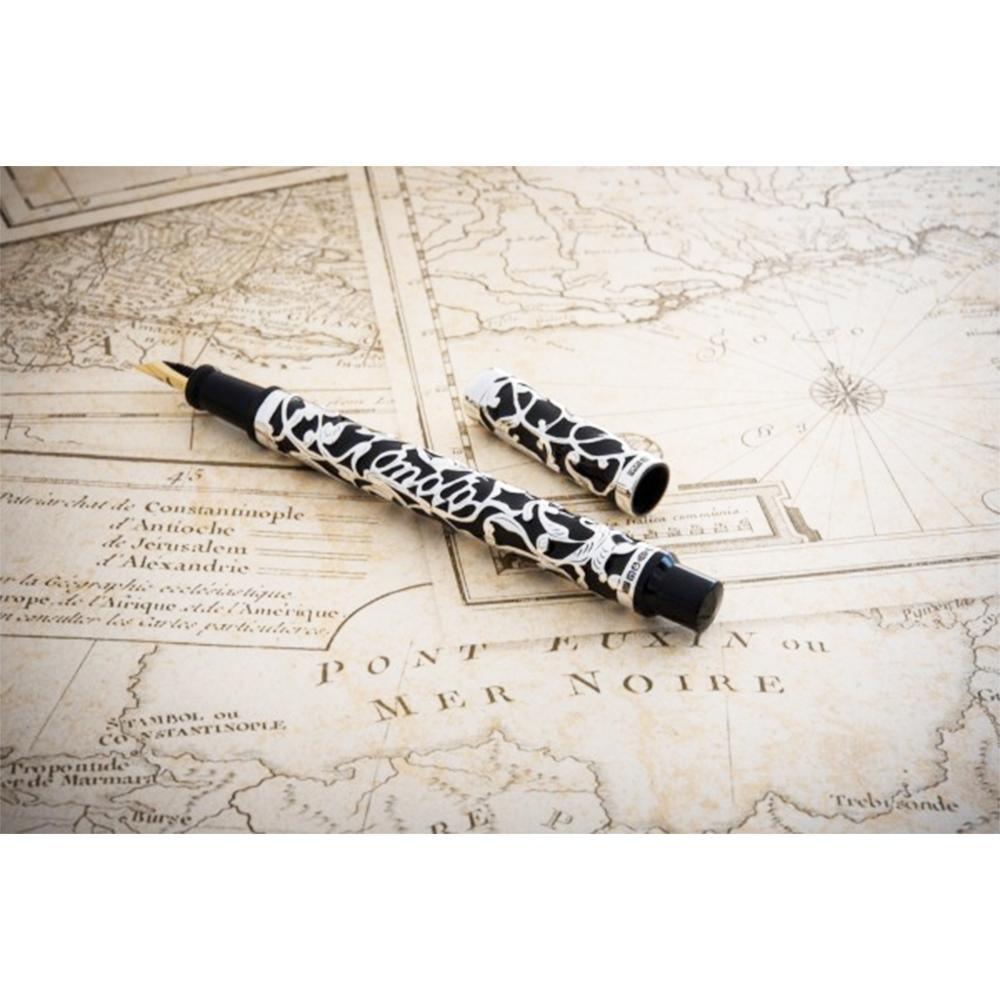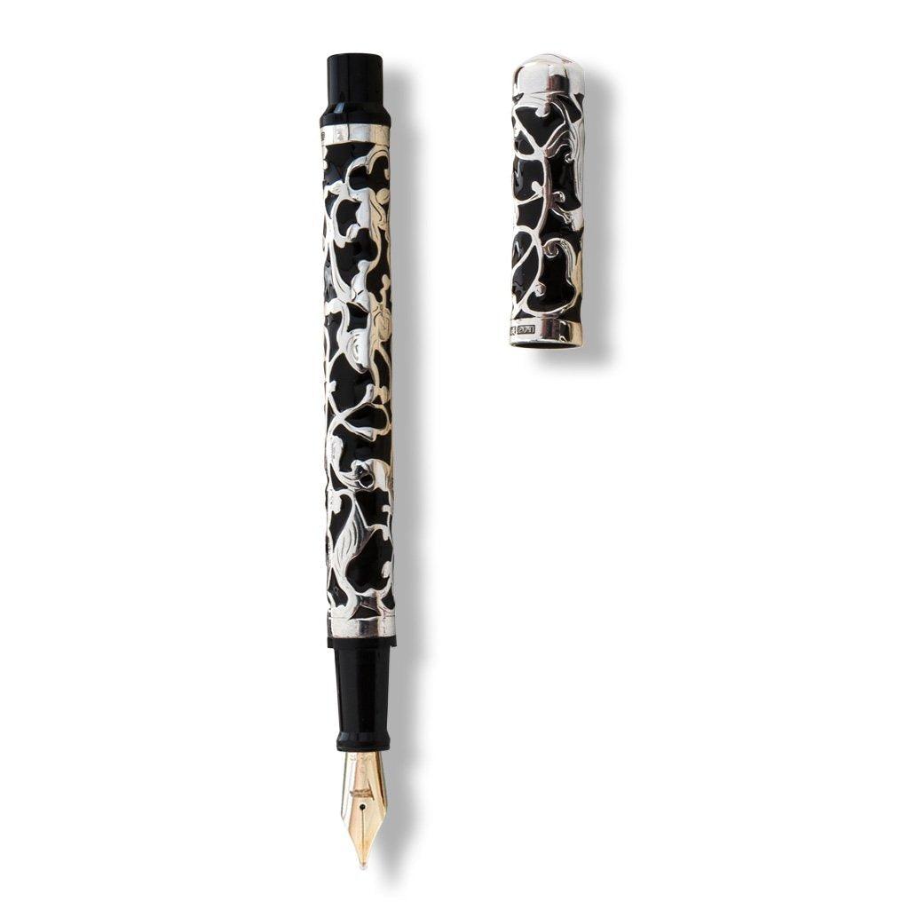 Conway Stewart の限定版 1907 'Exhibition' ペンは、完璧なデザイン スキル、細心の注意を払った職人技、ホールマーク付きのスターリング シルバーを組み合わせた、英国のペン製造への見事な賛辞です。ロンドンの銀細工職人、ヘンリー・シンポールによって制作されたこの精巧な万年筆は、複雑なシルバーのオーバーレイと、伝統的な七宝焼きスタイルのリッチなブラック エナメルが特徴です。わずか 35 本の限定版で発行されたこのペンは、機能的な筆記具であると同時に芸術作品でもあり、世界中のヘンリーの優れた職人技のコレクターやファンから非常に人気があることは間違いありません。早めの予約をお勧めします。