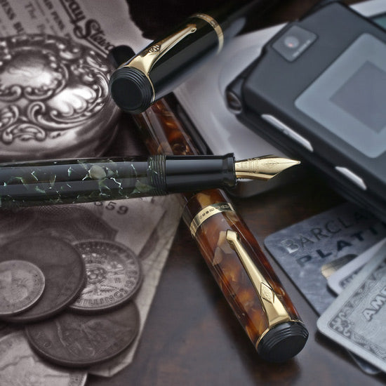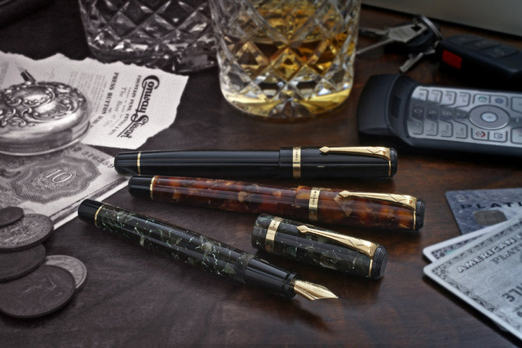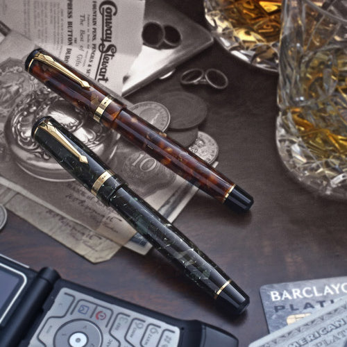 简洁的线条让人想起康威斯图尔特早期的钢笔和三种经典而美丽的颜色,这支钢笔还采用了公司自 1900 年代初以来使用的第一个阶梯式笔帽和笔杆端。经典黑色 黑色搭配金色镶边低调优雅;大理石纹的经典棕色从茶色到黄褐色都有可爱的变化;大理石纹的经典绿色有深绿色和灰色,偶尔带有白色亮点。有人告诉我,绿色是目前英国最流行的颜色;我个人很难在它和棕色之间做出选择,因为我喜欢这两个颜色系列。黑色也很漂亮,无疑会吸引那些擅长微妙的人。
